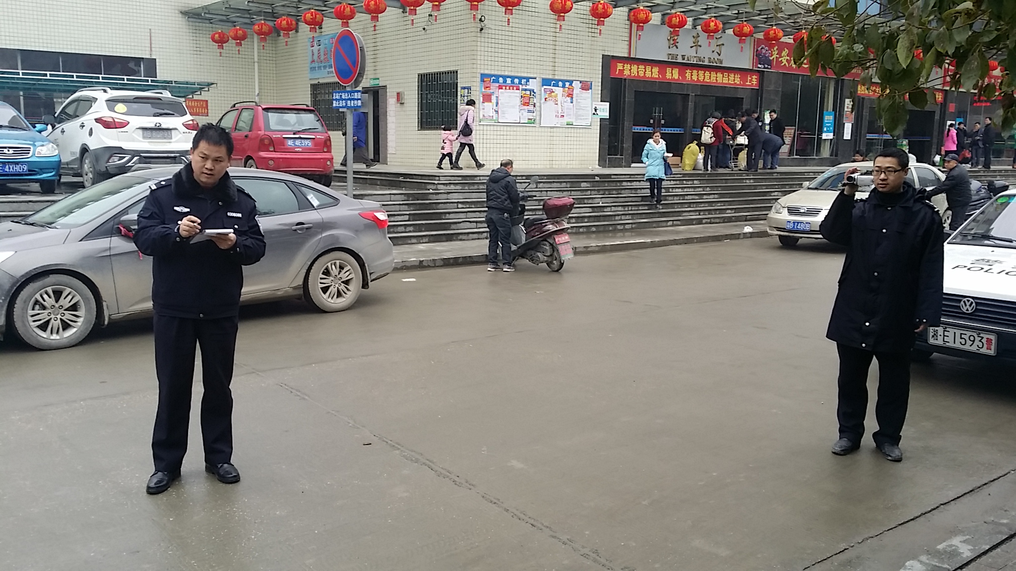 圖為湘運集團洞口客運分公司稽查保衛(wèi)科工作人員配合交警部門對亂停亂擺車輛進行抄牌錄像。